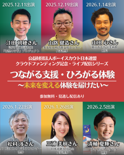 ボーイスカウト日本連盟は、2025年12月10日〜2026年2月10日のクラウドファンディング期間にあわせて、子どもの体験保障の最前線で活動する専門家をお招きし、全6回のライブ配信を行います。
