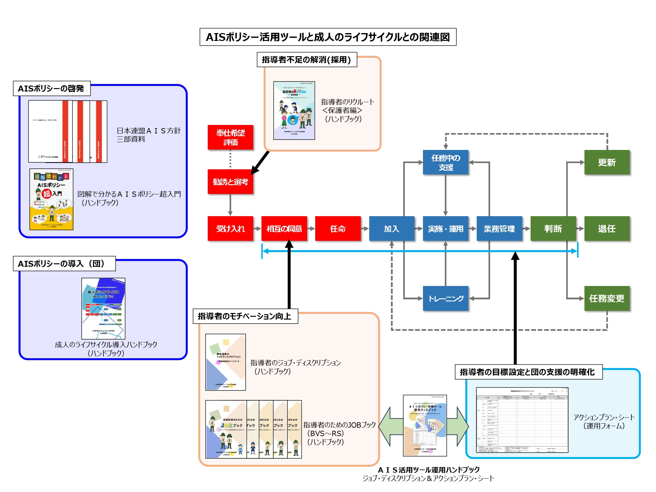 本冊子は、『団における成人のライフサイクルの活用』シリーズとして提供しているAISポリシー活用ツールを運用していただくためのハンドブックです。成人のライフサイクルに照らし合わせて、この3つのツールを活用するための手順とヒントが書かれております。この冊子と3つのツールが、団における成人のライフサイクルの実践のアイテムとして活用していただけることを願い、制作しました。